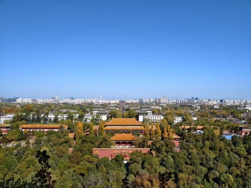 登上公园制高点万春亭,更能收获“一眼揽尽京城秋”的绝佳体验。此处可俯瞰中轴线风貌,将紫禁城壮丽景致尽收眼底:东门外银杏与园内景致连成金色长廊,南望紫禁城层层金顶在晴空下熠熠生辉,北瞰中轴线如流动的历史画卷徐徐展开,与脚下斑斓彩叶相映成景。