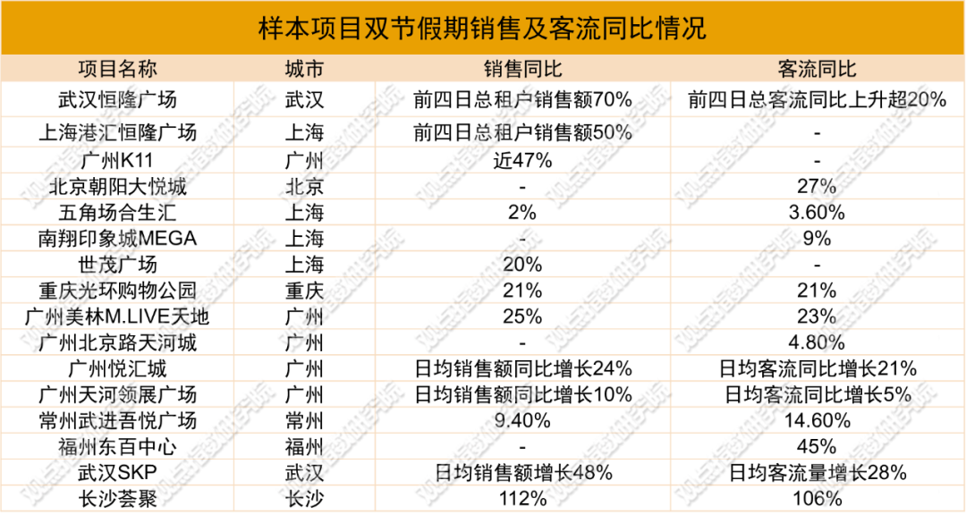 期内,大部分样本项目把握双节消费机遇,通过丰富的营销活动和会员促销策略取得不错的业绩,销售额和客流均实现同比增长。