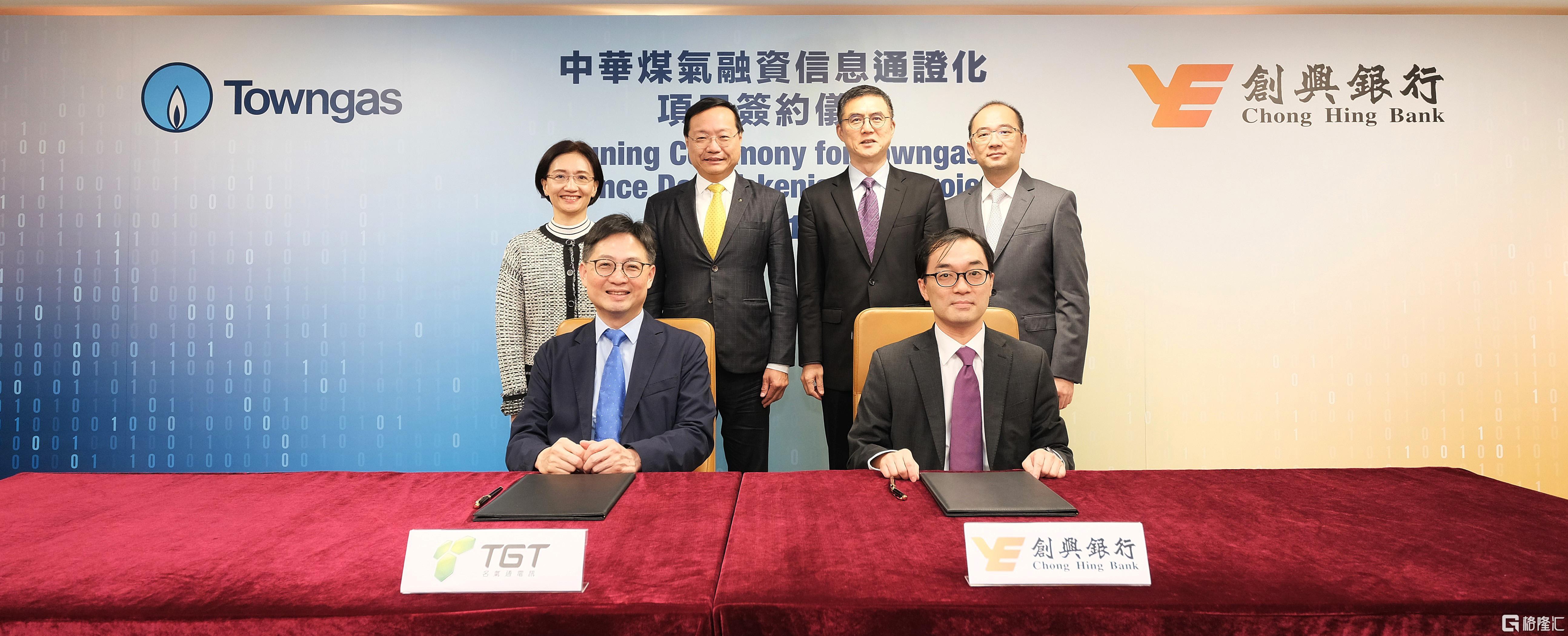在中华煤气执行董事暨首席财务总裁杨磊明(后排左二)、中华煤气集团财务及策略总监(香港业务)钟慧仪(后排左一)、创兴银行执行董事、副主席兼行政总裁宗建新(后排右二)、创兴银行执行副总裁—企业产品及业务发展部主管陈智棠(后排右一)见证下,名气通电讯有限公司总经理—电讯业务颜庆华(前排左)和创兴银行总经理—香港企业银行部主管黎嘉昌(前排右)签署贷款通证化协议。