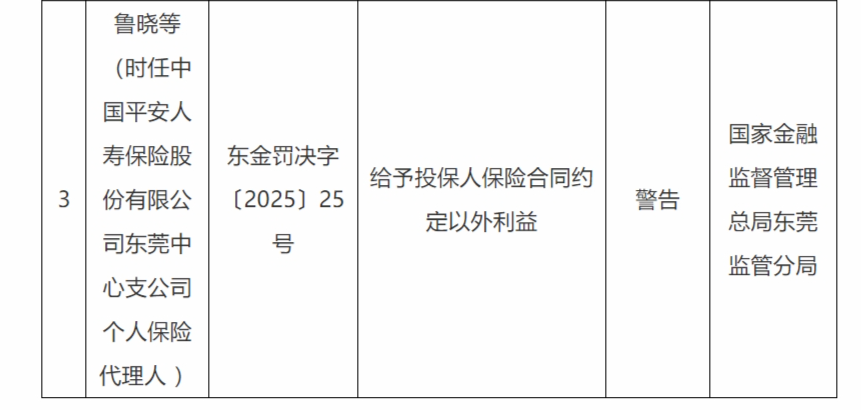 11月11日,国家金融监督管理总局东莞监管分局行政处罚信息公开表(2025年24号、25号)显示,鲁晓等(时任中国平安人寿保险股份有限公司东莞中心支公司个人保险代理人),给予投保人保险合同约定以外利益,被警告。