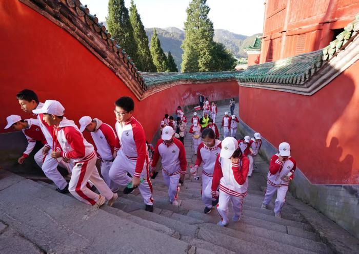 11月11日,北京中学生千人研学团走进湖北十堰武当山,在太子坡,学生们观摩世界文化遗产武当古建筑群,看“一柱十二梁”古建筑奇观,亲身体验榫卯结构,感受古建筑技艺的精湛。