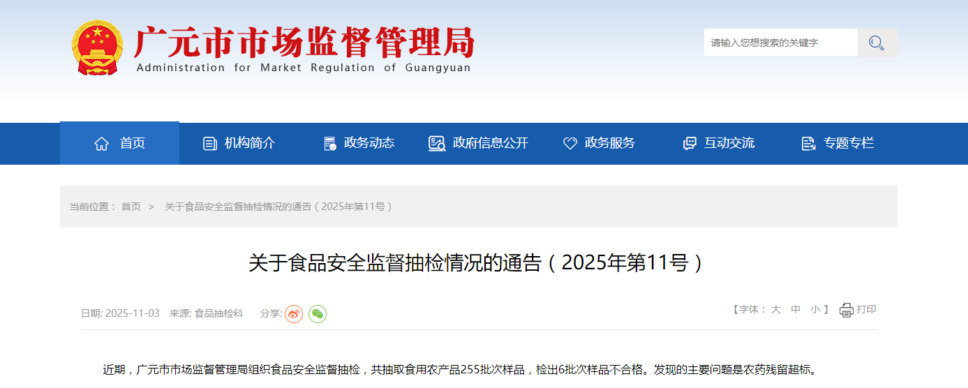 近期,广元市市场监督管理局组织食品安全监督抽检,共抽取食用农产品255批次样品,检出6批次样品不合格。发现的主要问题是农药残留超标。