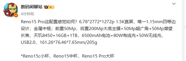 【CNMO科技消息】11月12日,有业内人士透露OPPO Reno15 Pro的详细规格参数,作为Reno15系列中的“大杯”机型,其在屏幕、影像、性能与续航等方面均展现出越级旗舰实力。该机采用6.78英寸1.5K分辨率(2772×1272像素)直屏,是目前同价位段中唯一实现1.15mm超窄四等边设计的机型,配合金属中框,兼顾视觉对称性与高端质感。