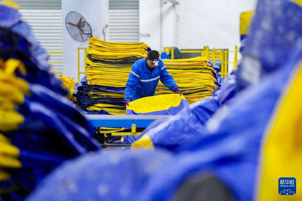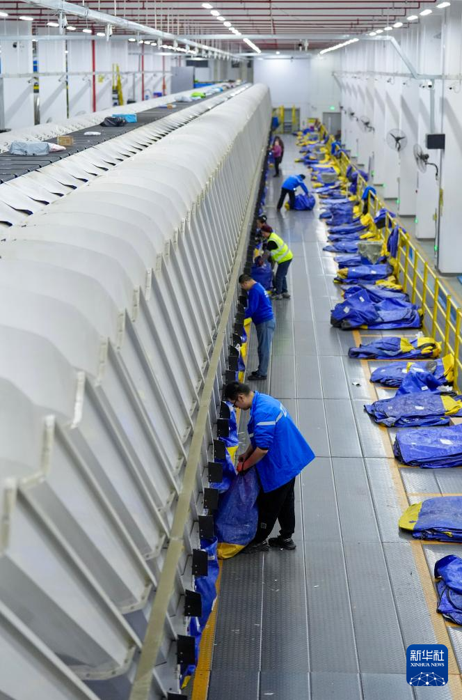 11月11日,在位于宁夏银川市贺兰县的中通快递宁夏管理中心内,工作人员整理拆包作业后的快递袋。
