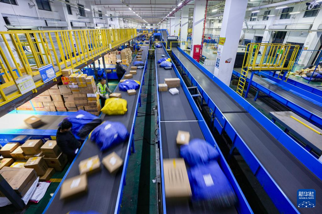 11月11日,在位于宁夏银川市贺兰县的中通快递宁夏管理中心内,工作人员分拣快递。