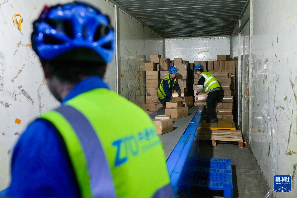 11月11日,在位于宁夏银川市贺兰县的中通快递宁夏管理中心内,工作人员进行卸车作业。
