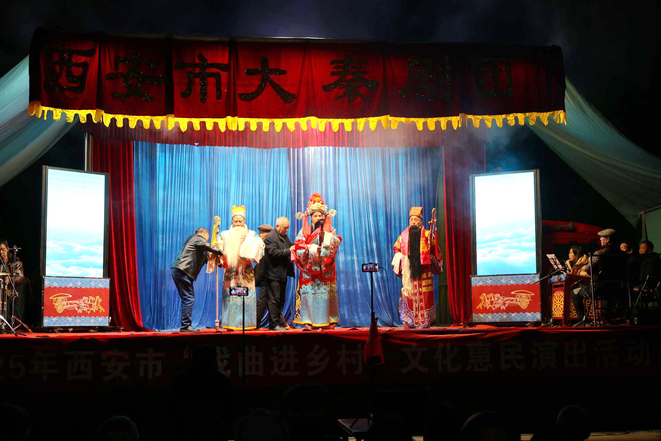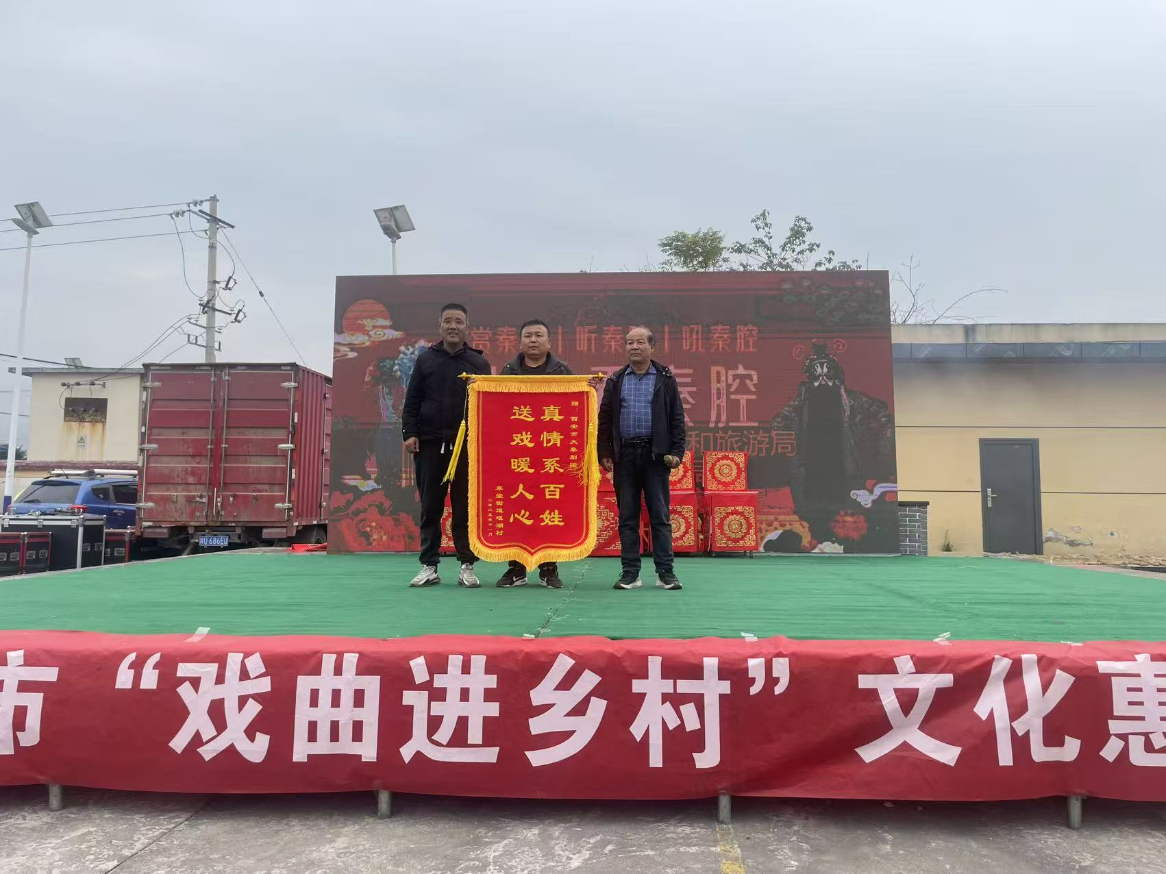 值得一提的是,此次演出期间,暖心场景不断涌现。多个点位的村民自发为演出团队送来锦旗,并为演员披上红绸缎,情真意切的锦旗和鲜艳的红绸缎,承载着最淳朴的喜爱与敬意。草堂街道堰湖村结束后,村民代表手持红底金字的锦旗登台,“真情系百姓,送戏暖人心”10个大字熠熠生辉,表达了对演出的高度认可。“在家门口就能看到这么专业的秦腔戏,演员们唱得地道、演得传神,真是过足了戏瘾!”庞光街道庞新社区焦东村的戏迷王大爷难掩喜悦之情,对演出赞不绝口。与其持相同观点的观众不在少数,均对活动给予高度评价。