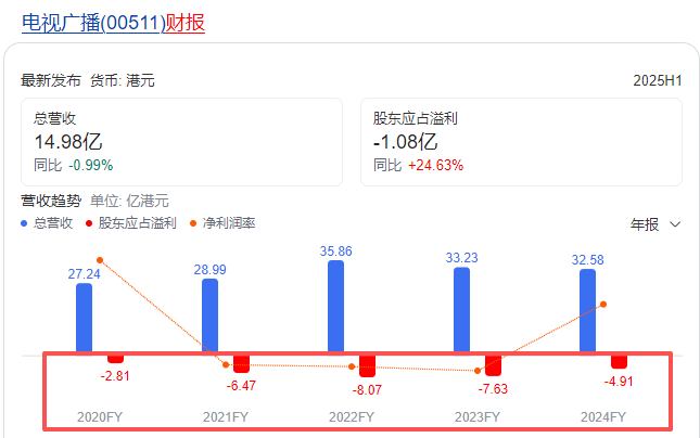 TVB借此狠狠“补”了一下元气。财报来看,TVB 母公司已经连续多年不景气,近5年的亏损额超30亿港币,各种平台的广告收入都在下跌。