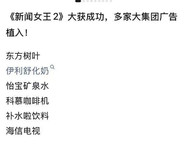 网友算了一下,《新闻女王2》前4集,一共有6家品牌出现在广告植入中,而且植入得非常刻意。第一集一共43分钟,有广告嫌疑的画面出现了超过10次,观众平均每隔4分钟就要“被迫”看一下品牌露出。