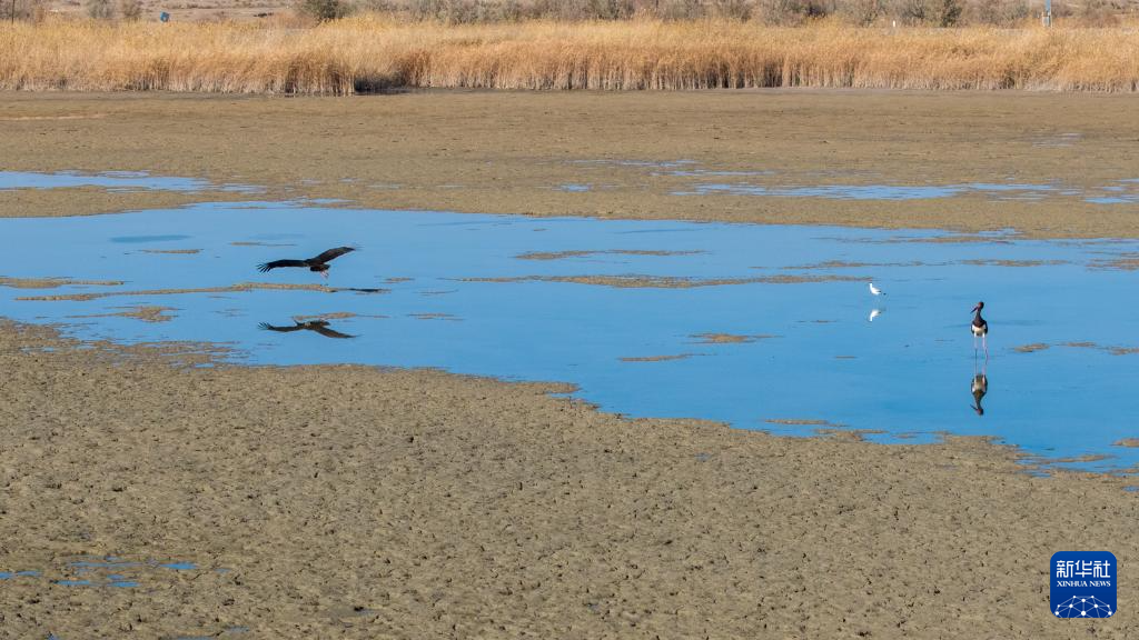 11月12日,黑鹳在张掖黑河湿地国家级自然保护区高台段一处湿地浅滩觅食。