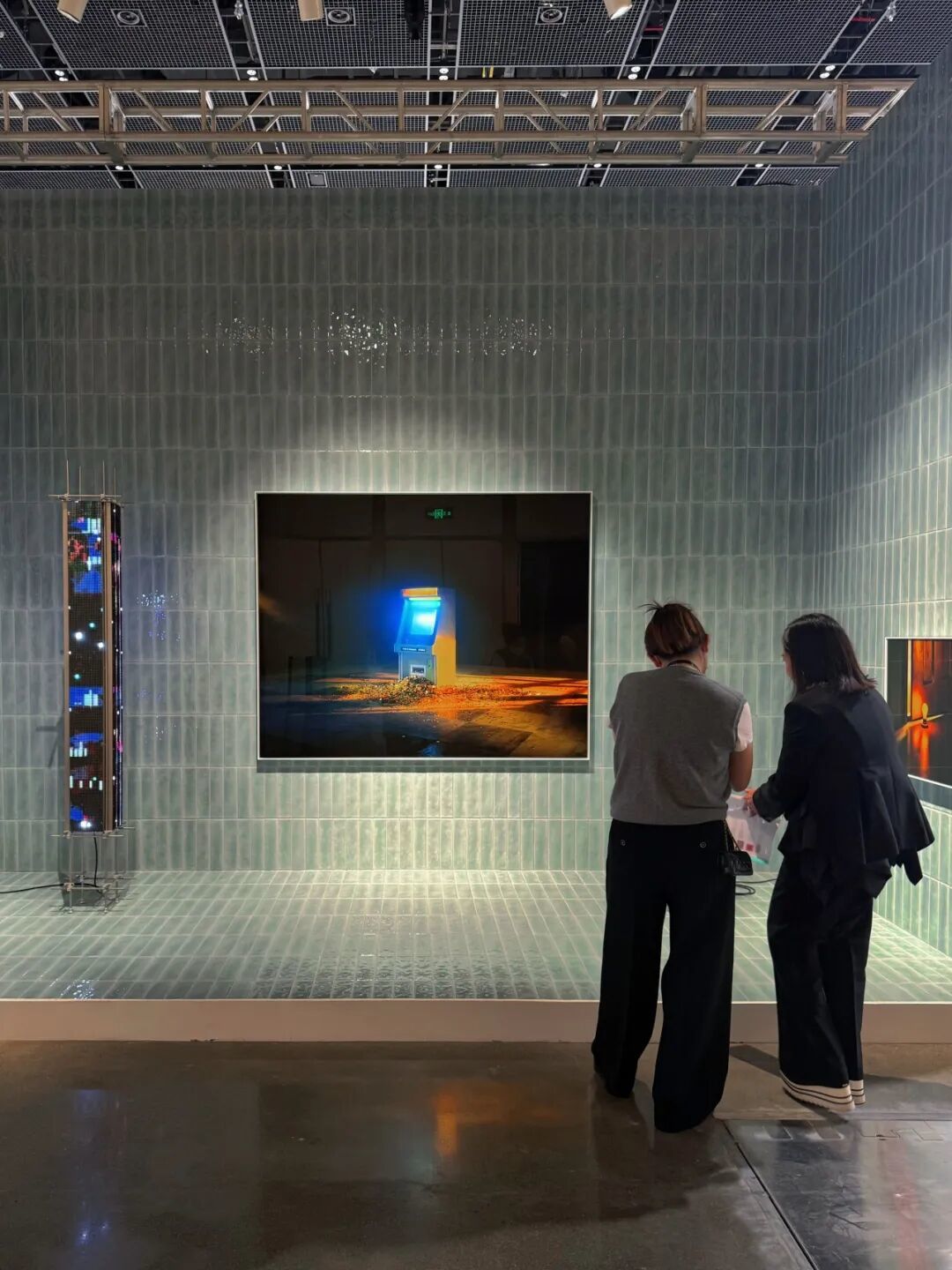 步入新展厅,依然稳居入口要位的大田秀则画廊今年将那颗标志性的巨型南瓜悄然隐于展墙之后,取而代之的是闪烁着数字光影的新媒体作品与静静陈列的摄影图像,绿色方盒状展墙营造出独特的展示氛围,颇有一种赛博朋克般模糊时空界限的视觉效果,瞬间便带来一种耳目一新的观感,也让人不禁对本届展会多了几分期待。
