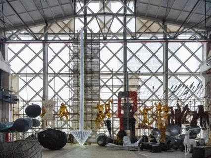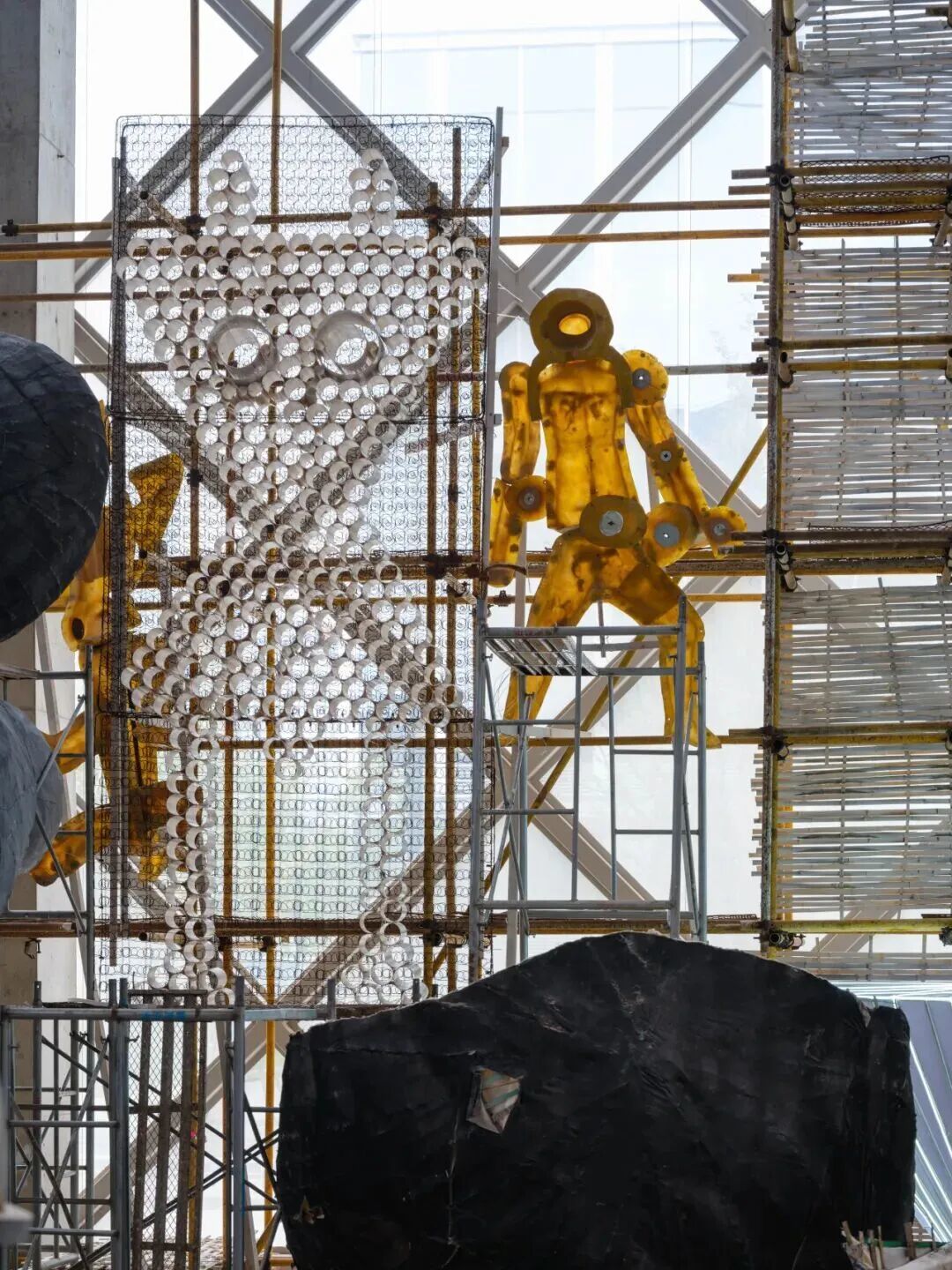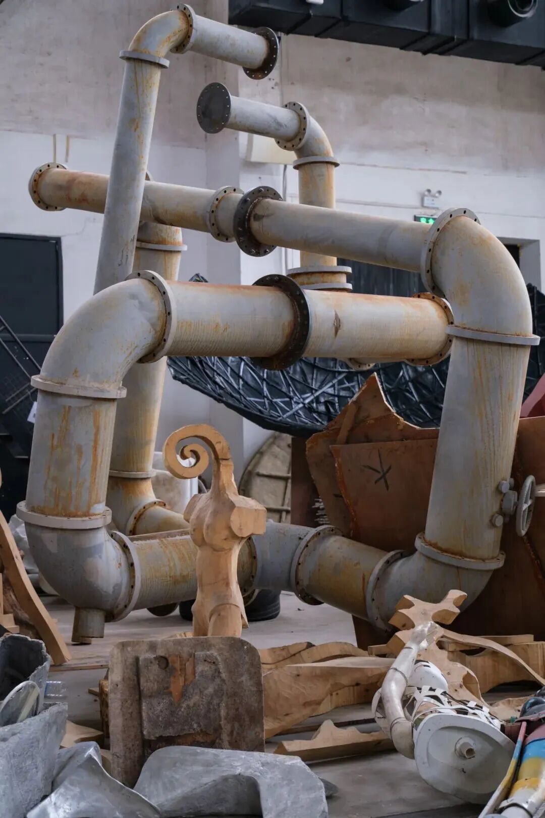 这是一次与场地历史、城市记忆及未来想象的深度对话,上海从渔村、农业社会、工业重镇直至迈入信息时代的层叠历史,以及西岸厂房本身从工业遗存转向文化场域的变迁,为作品提供了天然的叙事语境。艺术家有意运用农业时代旧物、工业废料与其他艺术创作中的剩余材料,这些携带不同时空痕迹的“陌生者”在展场中重构为一个看似混乱、实则充满叙事张力的物质剧场。