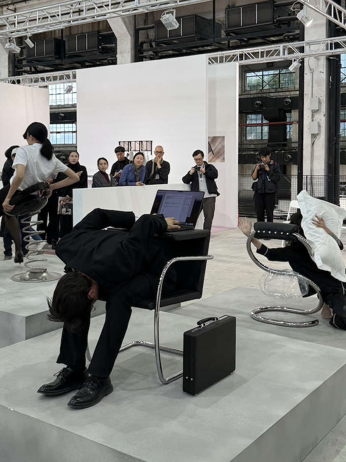 值得关注的是,在西岸艺术中心A馆二层中庭区域,李鸿玺工作室带来了名为《三点一线》的行为艺术作品。作品由三件椅子雕塑和30分钟的现场表演组成:伴随着现场录制的声音景观,表演者借助椅子雕塑演绎都市上班族工作、酒吧、回家的单调轨迹,关注人类如何在重复日常中被消耗与打磨的过程。