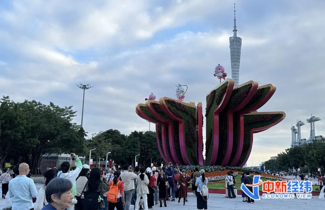 广州新中轴线核心节点的花城广场放置有击剑、篮球、拳击、滑板、射击等多款全运会吉祥物,来自天南海北、不同肤色、不同年龄的游客和市民在此拍照留念。广场中央设有大型花卉景观装置,顶部站立数款全运会吉祥物。大批游客和市民在此排队数十米,只为捕捉到广州塔耸立在多彩花卉之间的景色。