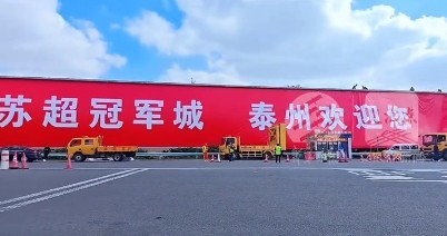 据交汇点视频报道,泰州“苏超”夺冠标语越来越大了,泰州高速口已经搭好巨幅冠军标语——“苏超冠军城,泰州欢迎您”。