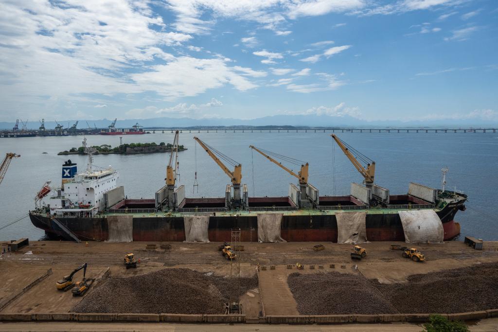 4月3日,货船在巴西里约热内卢的一处港口装载铁矿石。新华社记者王天聪摄