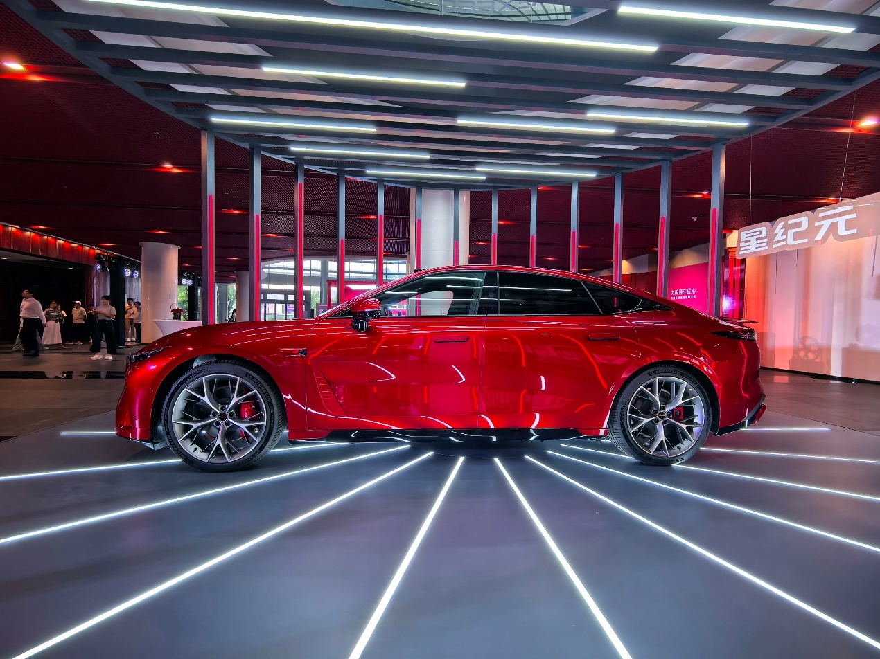 侧面采用了溜背式车身设计,通过下压式车头、鲨鱼鳍、隐藏式门把、无框车门等,让新款星纪元ES看起来优雅十足,同时风阻系数低至0.205,兼顾了美观和实用。高配车型提供大尺寸运动轮圈,进一步强化了整车的性能范儿。