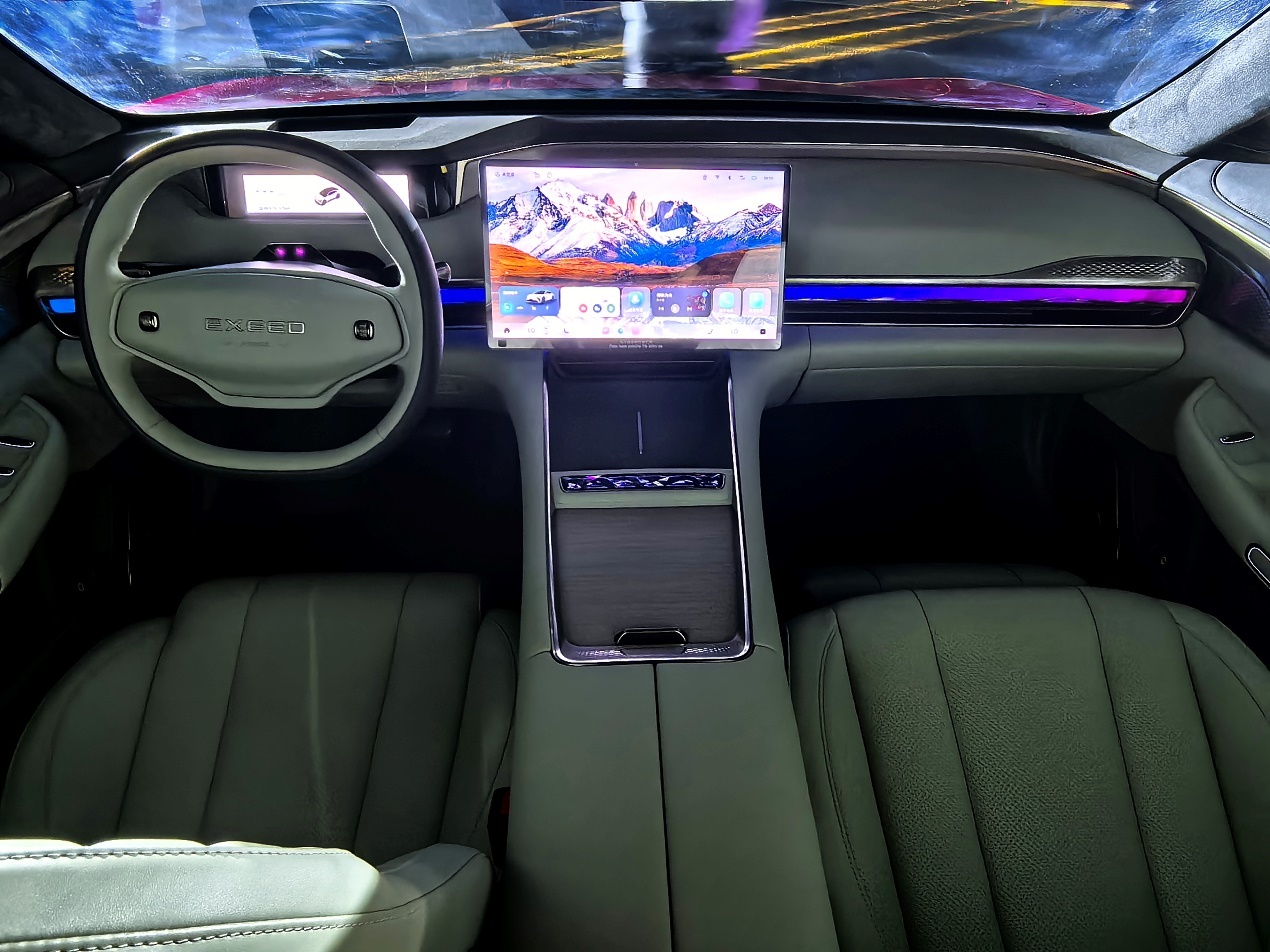 移步车内,能感受到理工男独有的高级感审美。中控台采用大刀阔斧的线条勾勒,舒展且大气,配合大面积的软质包覆,那是肉眼可见的满足。中控台提供超大尺寸中控屏和长条式液晶仪表盘,搭配双辐式多功能方向盘,有点未来座驾的感觉。