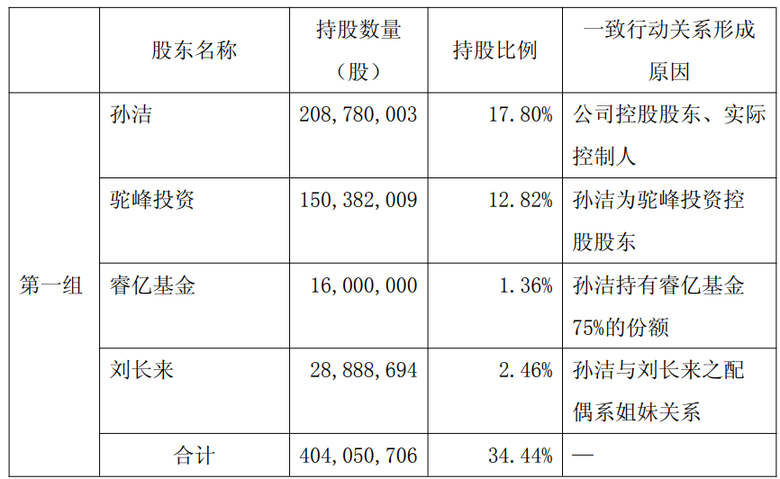 截止公告日,公司董事长刘长来持有公司股份28,888,694股,占公司总股本的2.46%;公司控股股东、实际控制人孙洁及其一致行动人湖北驼峰投资有限公司(以下简称“驼峰投资”)、上海睿亿投资发展中心(有限合伙)—睿亿投资揽月六期私募证券投资基金A(以下简称“睿亿基金”)、刘长来合计持有公司股份404,050,706股,占公司总股本的34.44%。