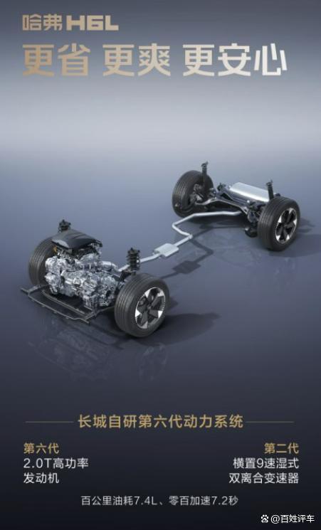 与之匹配的是全球首款横置 9DCT 湿式双离合变速箱,经过严苛赛事验证,性能可靠。这款变速箱拥有 8.13 的超大速比跨度,实现了 120km/h 时速下 1800 转的低转速运转,传动效率比 8AT 变速箱高 2.72%,不仅换挡平顺迅速,几乎感受不到顿挫,还能有效降低油耗 。在这套黄金动力组合的加持下,哈弗 H6L 的 0-100km/h 加速仅需 7.2 秒,动力迅猛,推背感十足;而 WLTC 百公里油耗仅为 7.4L,燃油经济性出色,真正做到了动力与油耗的完美平衡 。