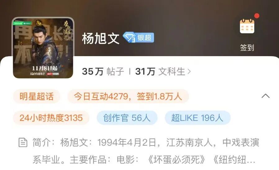 作为《唐诡》双男主之一的杨旭文,微博粉丝数1000万+,但超话24小时热度仅3100+,这还是剧集在播期间的数据。这说明,它依靠角色吸引到了一部分观众,但这些人多为剧粉,会关注演员,但不会为演员做数据。
