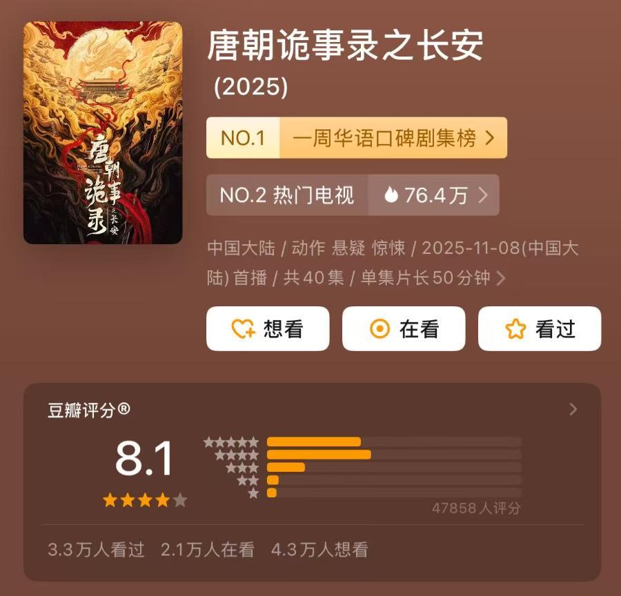 向来严格的豆瓣网友,对《唐诡3》也青睐有加。11月8日,《唐诡3》台网双端开播,仅3天,豆瓣开分8.1分,并创下了系列最快开分纪录。从观众反馈来看,第四案《诺皋记》口碑相当不错,豆瓣评分有进一步上升的可能。