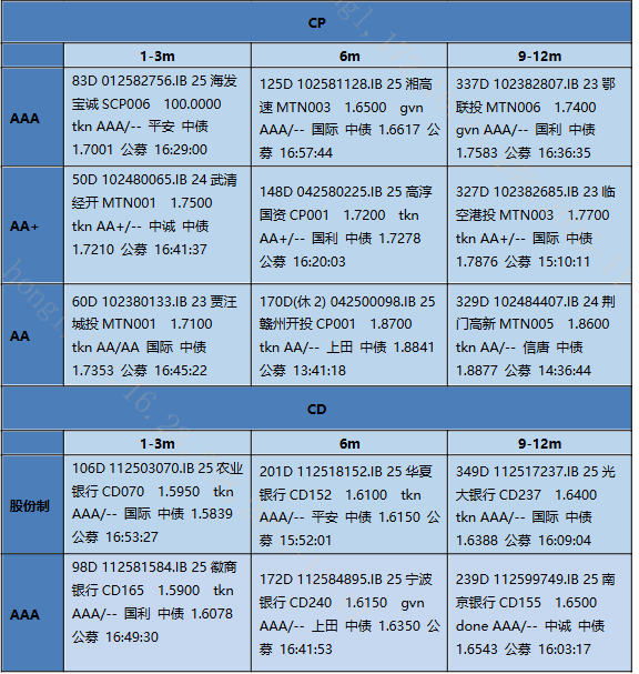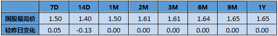 今日存单交易情绪一般。早盘情绪尚可,9M国股一度下至1.63。午盘上至1.635。全期限来看国股成交,明年2月底到期1.585;明年5月底到期1.6125;明年8月底到期1.635;明年11月底到期1.64。