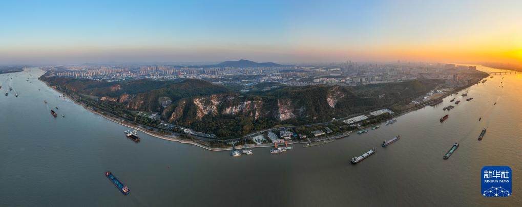 船只在南京幕燕滨江风貌区旁的长江上航行(2023年11月2日摄,无人机全景照片)。
