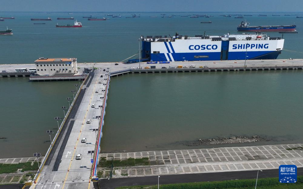 在江苏太仓港,装载3600余辆商品车的“玉衡先锋”号即将启程前往东南亚(2025年9月16日摄,无人机照片)。