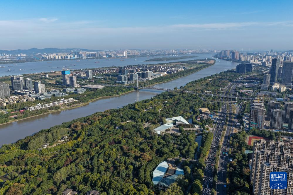 这是2025年11月18日拍摄的长江南京段滨江风光带(无人机照片)。