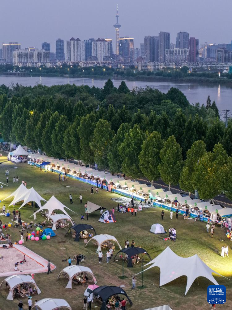 市民在南京市建邺区江心洲江边绿地露营休闲(2025年10月1日摄,无人机照片)。