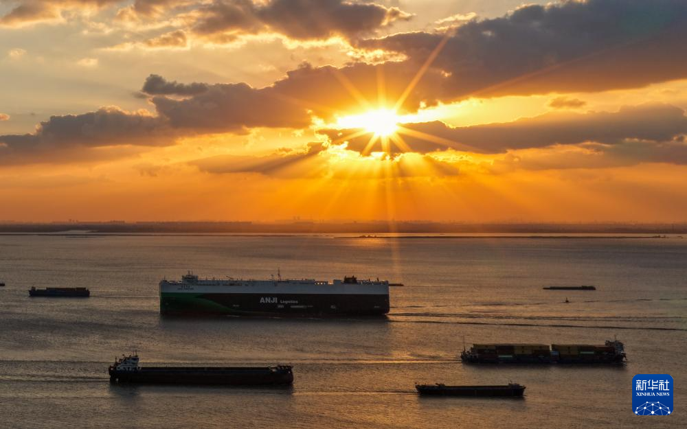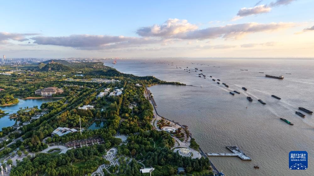 长江江苏段江面,百舸争流;江畔美景,如珠链铺展。