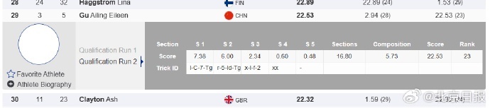 其他中国选手方面,杨如意排名第11,刘梦婷位列第14,韩林杉排在第17位,三人同样未能晋级决赛。