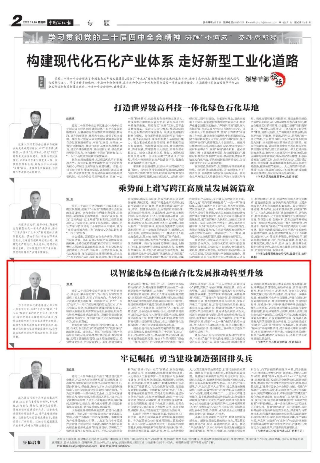 11月20日,广州石化公司代表、党委书记刘琤在《中国石化报》2版领导干部论坛发表署名文章《以智能化绿色化融合化发展推动转型升级》。