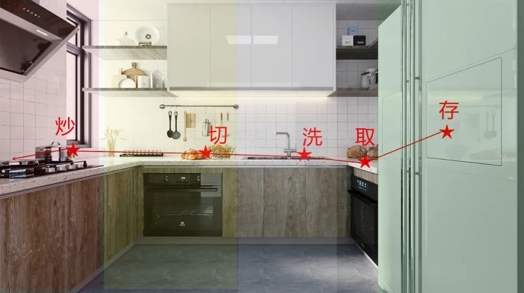 若条件允许,可以按“洗菜的水槽→切菜的台面→炒菜的灶台”来分布操作台的布局,方便做饭的流程与动线。