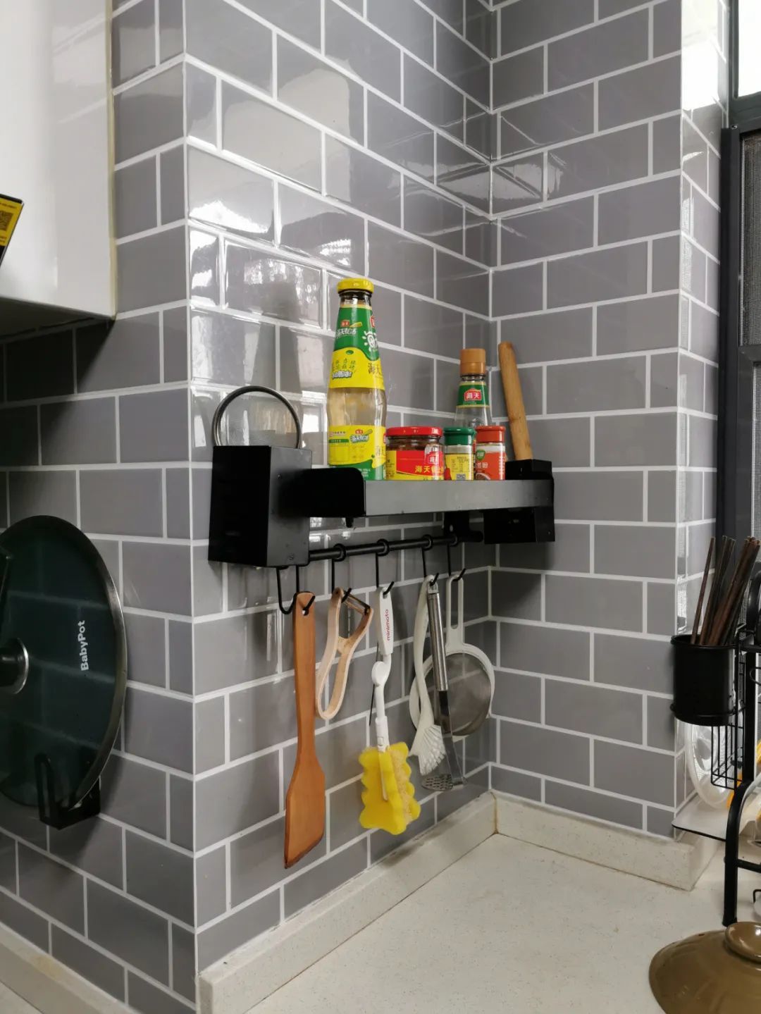 厨房的空间有限,想要做饭得心应手,合理的收纳不可少,因此在空白的墙面上装挂钩、收纳架,也是让厨房空间利用起来的好方案。