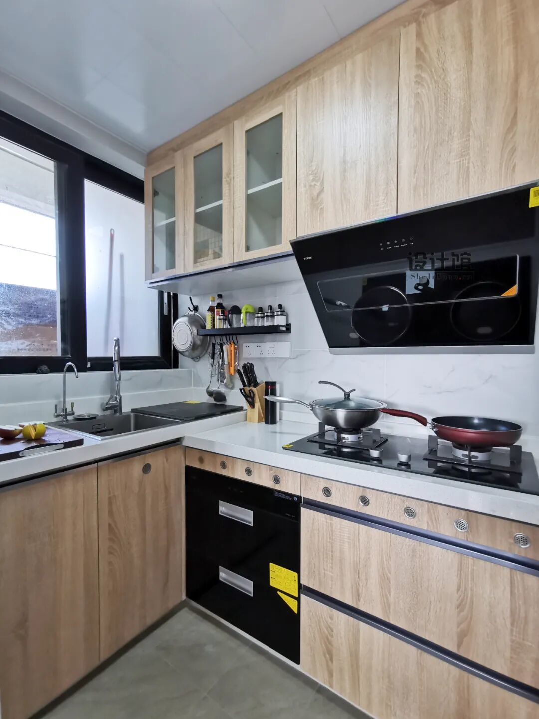 橱柜建议装一两个不装柜门的开放区,方便一些常用物品的摆放,毕竟橱柜是一个使用频率极高的地方,若把东西都藏在橱柜里面,每天都要开门翻柜找东西,甚至还可能是热油上锅的时候。