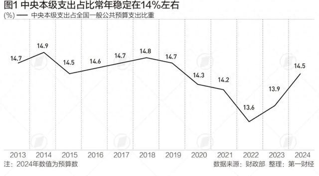 第一财经整理近十来年数据发现,全国一般公共预算中,中央财政本级支出占全国一般公共预算支出比重在14%左右波动,2024年这一比重预计为14.5%,较2023年略有提高。这也意味着地方财政支出占比常年稳定在86%左右。