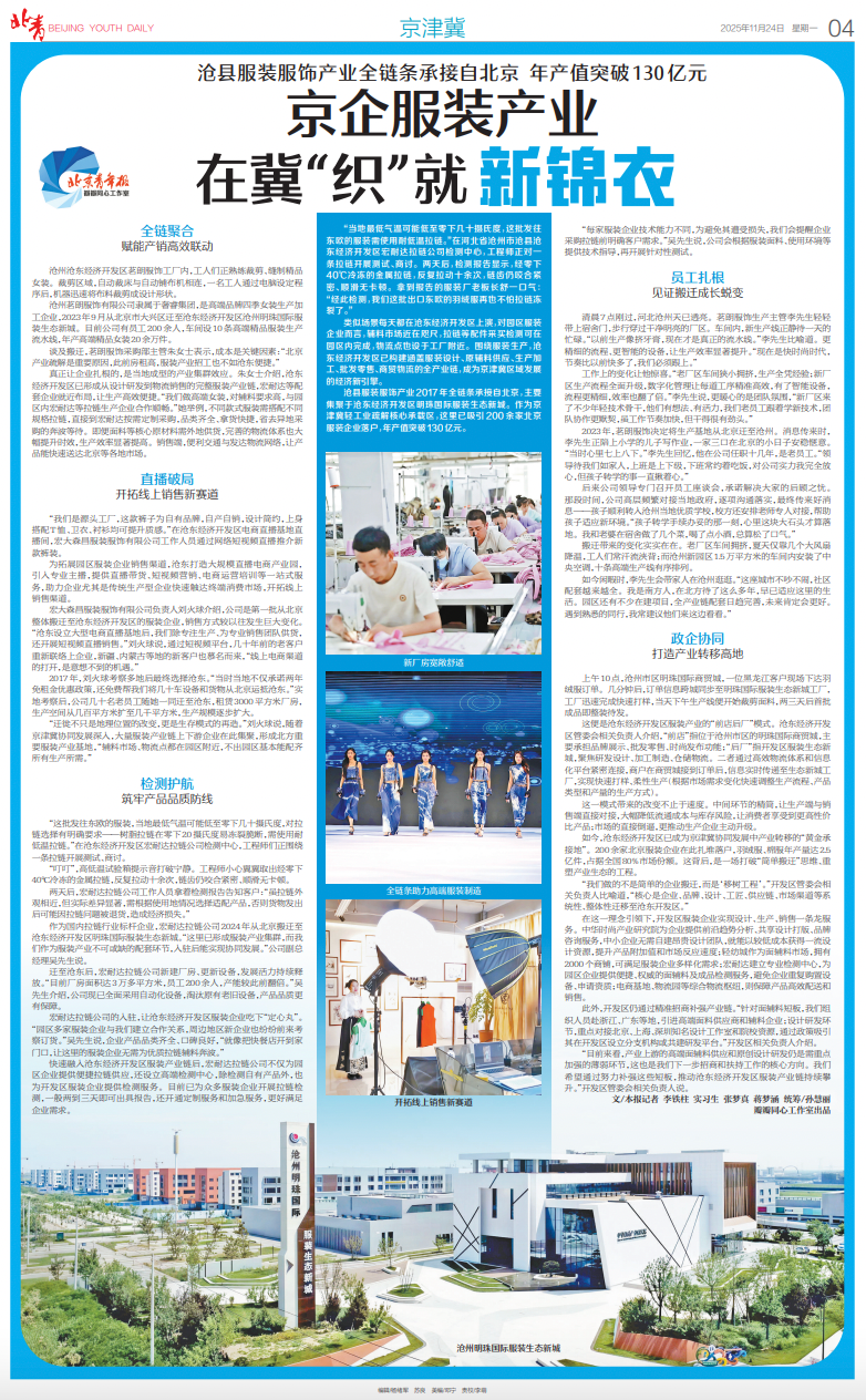 类似场景每天都在沧东经济开发区上演,对园区服装企业而言,辅料市场近在咫尺,拉链等配件采买检测可在园区内完成,物流点也设于工厂附近。围绕服装生产,沧东经济开发区已构建涵盖服装设计、原辅料供应、生产加工、批发零售、商贸物流的全产业链,成为京津冀区域发展的经济新引擎。