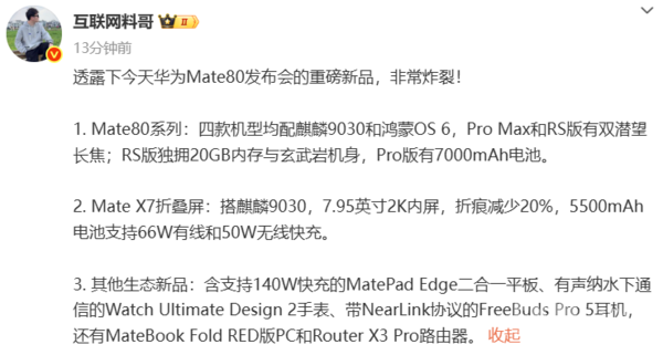 【CNMO科技消息】11月25日,有博主爆料:华为Mate 80系列/Mate X7及全场景新品线上发布会除了Mate 80系列四款机型和Mate X7折叠屏外,还可能推出包括二合一平板、高端智能手表、TWS耳机、折叠屏笔记本和艺术路由器在内的多款全场景生态产品。
