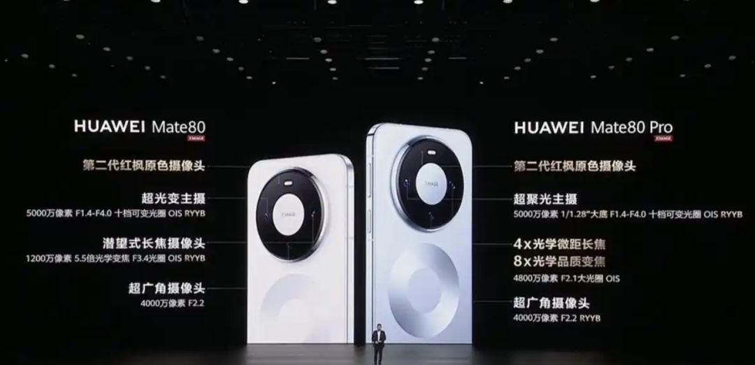华为 Mate 80 Pro 后置 50MP 超聚光主摄(RYYB、OIS、十档可变光圈)+40MP 超广角(RYYB)+48MP 超聚光微距长焦,前置 13MP 超广角镜头。