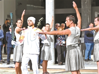11月26日,第一棒火炬手、希腊运动员盖达提斯(前左)传递火炬 供图/新华社