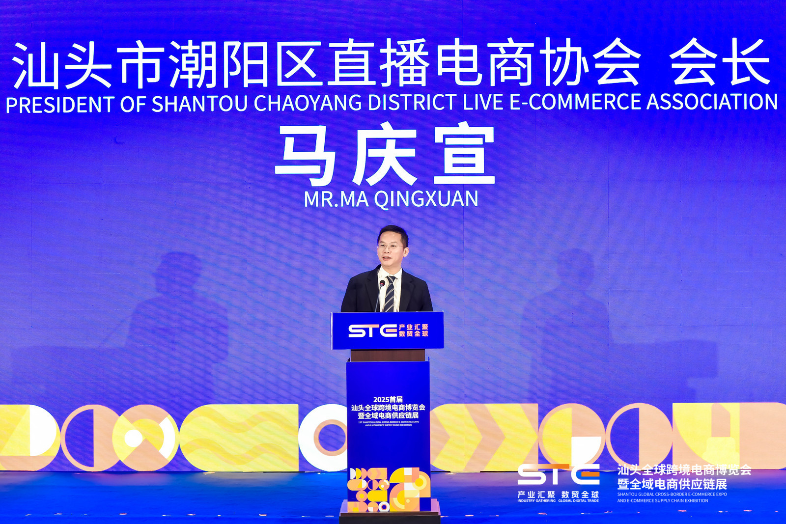 作为本次展会主办方代表,汕头市潮阳区直播电商协会会长马庆宣在致辞中阐述了展会筹备的初心与使命。他表示,汕头拥有纺织服装、美妆个护、家居日用等千亿级产业带根基,主办方希望通过本次展会搭建起产业桥梁,激活跨境发展动能,让本地优质货源精准对接全球采购需求,助力“汕头制造”拓展国际市场空间。
