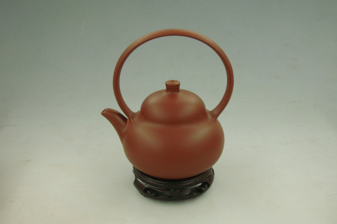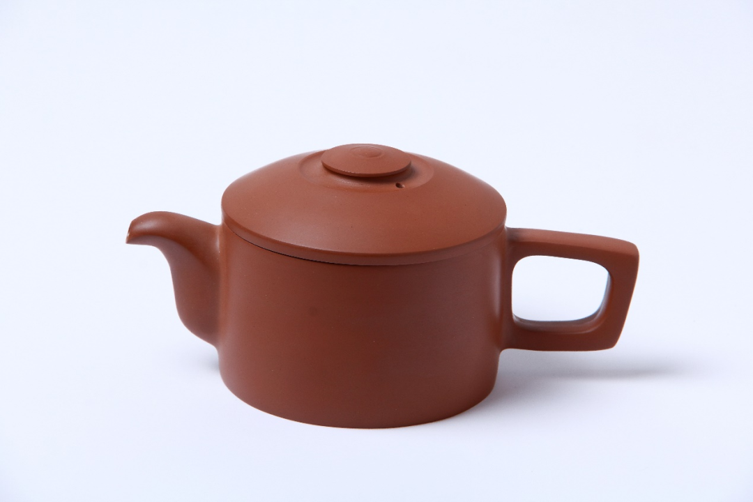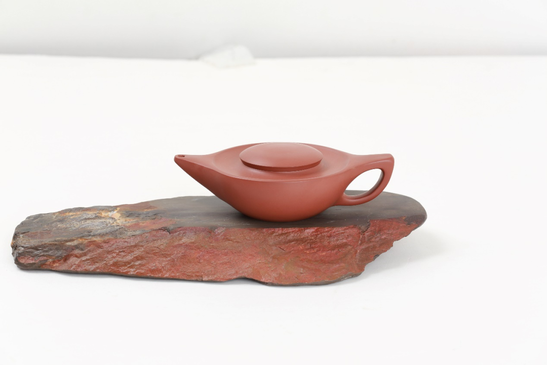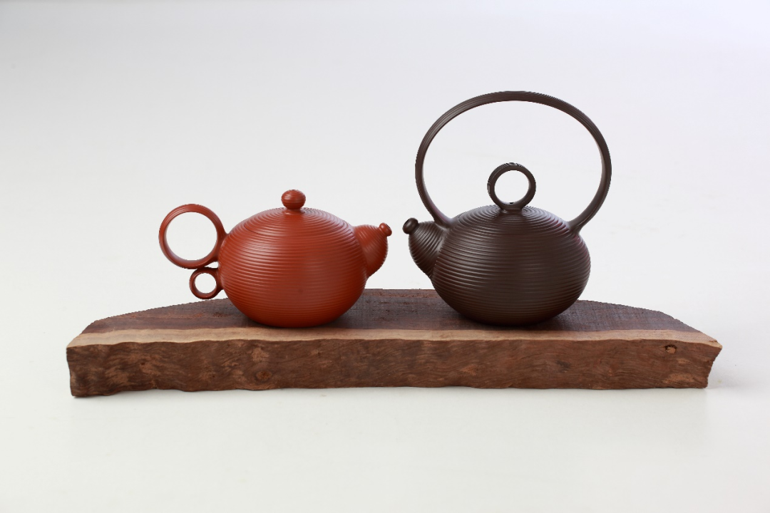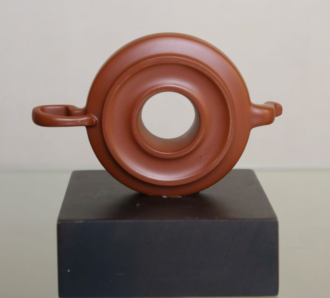 《同心圆壶》最引人注目的特征,莫过于壶中央那个犹如单眼望远镜的空心圆设计。这个被命名为“同心”的圆形结构,绝非简单的形式创新。朱泥材质温润的光泽在圆形结构上形成微妙的光影变化,使得这个“同心圆”仿佛具有了某种动态的视觉效果,宛如一个正在聚焦的镜头,呼应着“高瞻远瞩”的寓意。