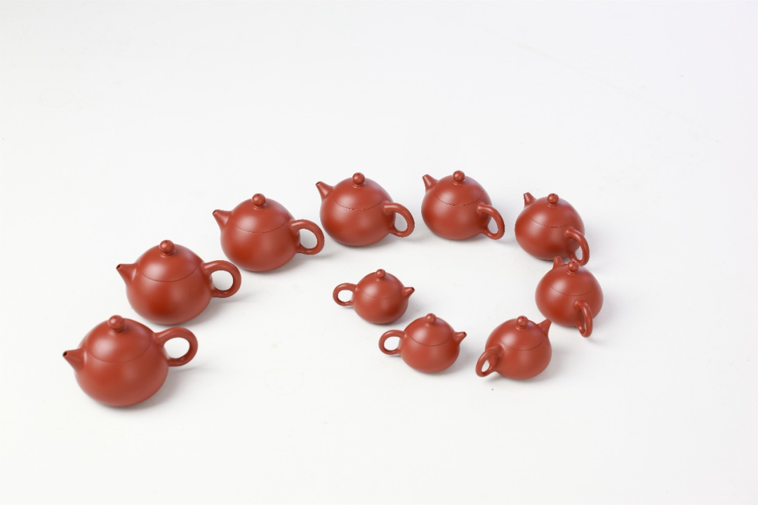 他的《十全十美》由十把西施壶组成,容量从一杯到十杯,朱泥红润,细腻如肤,线条流畅如行云,壶嘴短浅如美人之樱桃,把把貌若西施之妖娆。西施壶之美,美在壶型的变化与协调、均衡与流畅,节奏与韵律,气韵与生动,还有美丽的古老传说,这就增加了人文价值,最终成就了器物精神的升华。这正是其被中南海紫光阁收藏的原因所在。