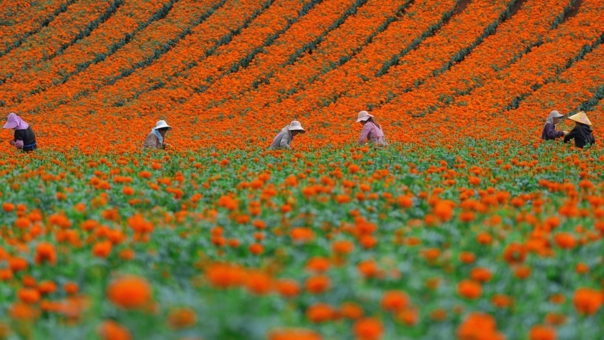 目前,丘北县金色万寿菊种植产业已经成为当地经济发展和乡村振兴的关键纽带。数据显示,自金色万寿菊种植产业项目落地以来,丘北县万寿菊种植规模从2011年的5000亩扩大至目前的75800亩,群众人均增收从4000元提升至18100元,增长率达352%。金黄色的万寿菊已经成为“致富花”和企地合作的成功典范。