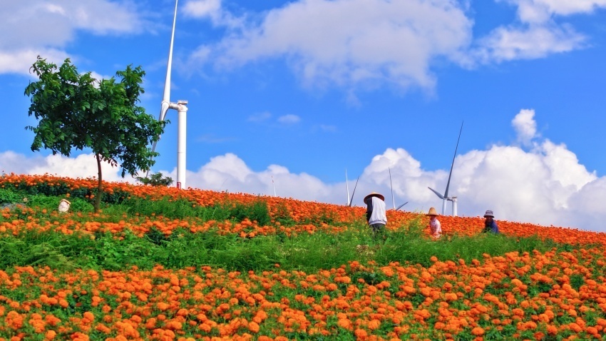 依托高原山地百万千瓦风电基地的壮观场景,地企携手打造“高原能源观光带”。围绕牛屎坡3A级景区,通过土地整合与规模化种植,连片打造3600亩万寿菊观光带,形成集能源科普、生态观光、农事体验于一体的农旅融合示范区。