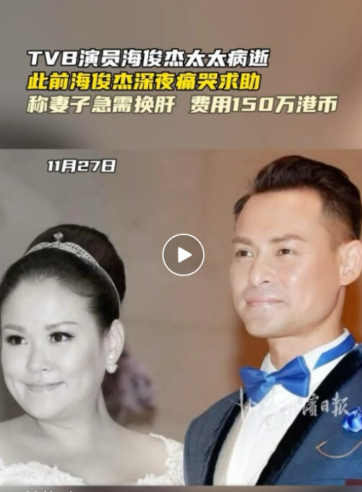 11月27日,据报道,TVB演员海俊杰妻子莫家慈离世。此前,海俊杰称太太莫家慈因患急性肝硬化,发布视频求援为太太筹集150万港币的手术费。