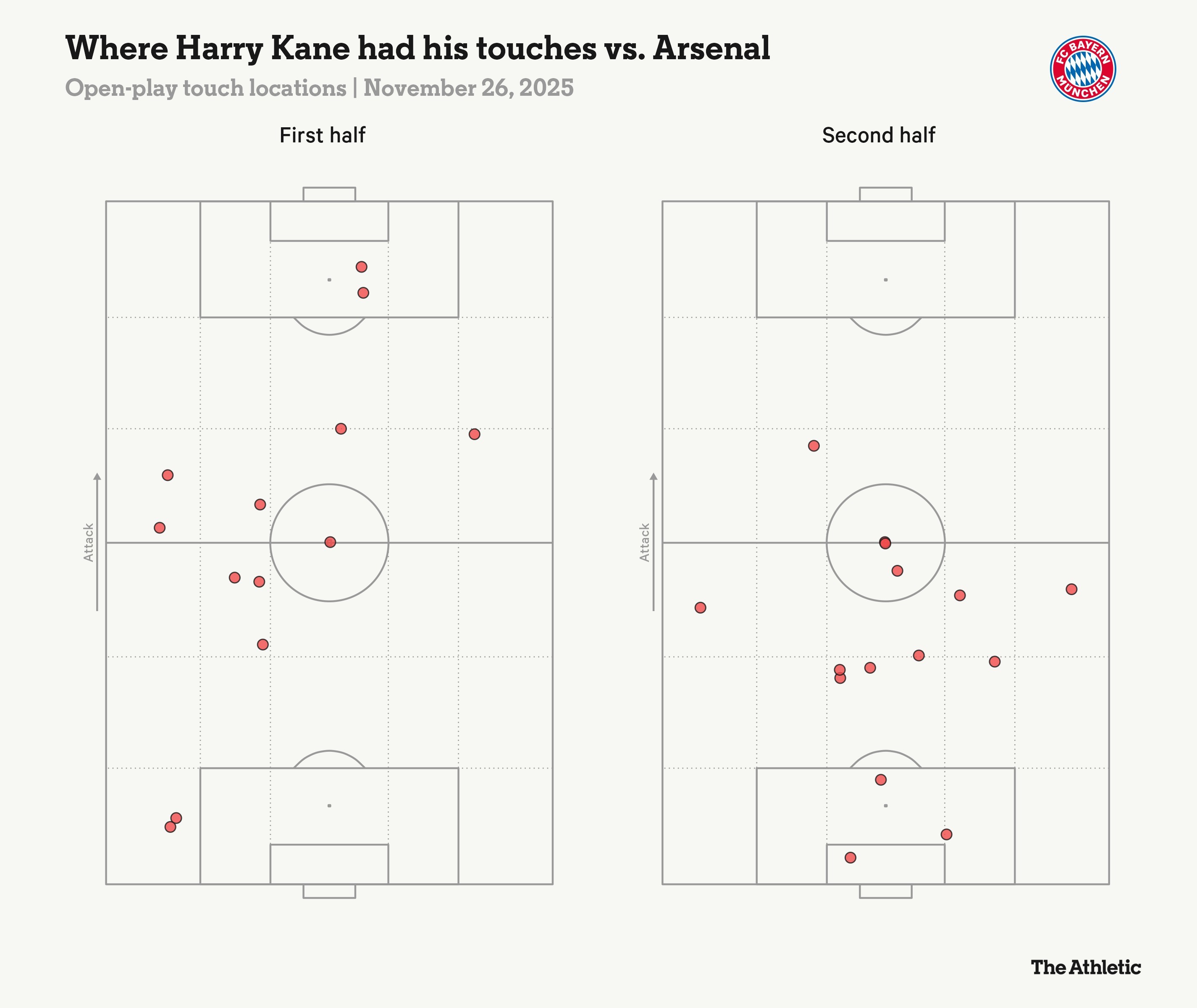 这位拜仁9号在90分钟的比赛里仅有30次触球,并且没有一次射门,这是自2023年10月以来,凯恩首次在欧冠比赛中零射门。这也是这位32岁的英格兰队长职业生涯中,首次在对阵阿森纳的比赛中踢满90分钟却未能完成一脚射门。