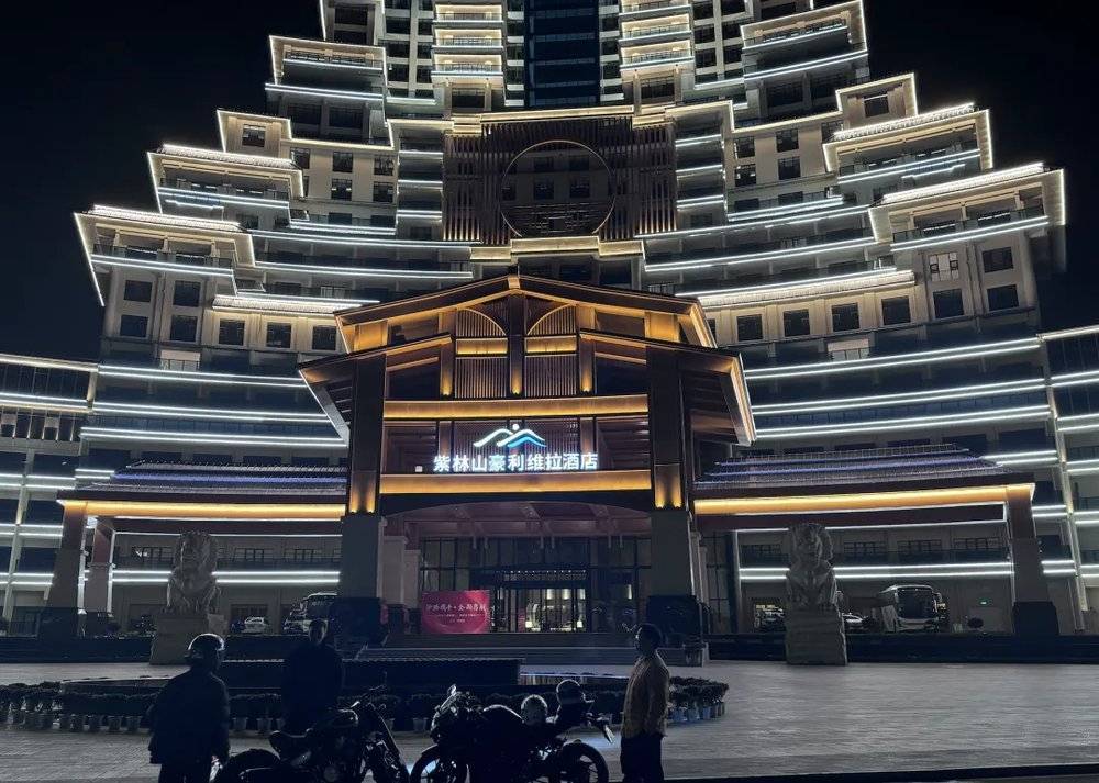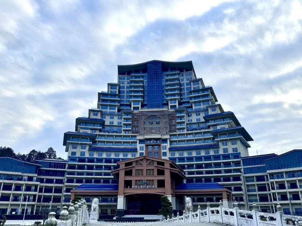 很多人知道这个地方,是因为这里的地标。一栋高约九十九米、占地超过八个足球场的巨型建筑,坐落在距离县城二十多公里的影山镇净心谷景区,如今名为“紫林山豪利维拉度假酒店”。